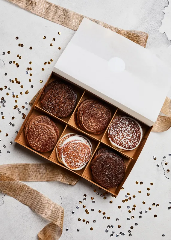 Crocante de almendra con chocolate belga Todas nuestras cajas de Melinas vienen surtidas para que puedas probar todas nuestras galletas